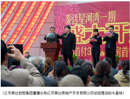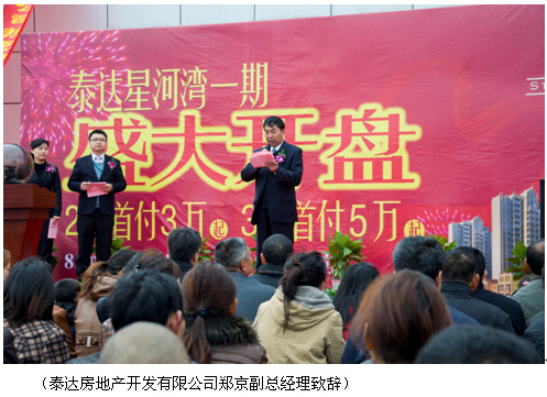 上午9點18分泰達星河灣首批房源開盤典禮正式開始,泰達房地產開發有限公司的鄭京副總經理發表了熱情洋溢的開盤致辭,江蘇泰達控股集團董事長蔣躍東先生和江蘇泰達房地產開發有限公司總經理徐興根先生上臺啟動了象征項目啟幕的水晶球,伴隨著一個個精彩的表演,客戶邊看節目邊耐心的等待叫號,在禮儀小姐的帶領下,按號牌順序陸續進入銷售中心選擇房源,截止到中午11點左右,大部分購房客戶都選到了自己中意的房源,整個上午共成功簽單近百單。
