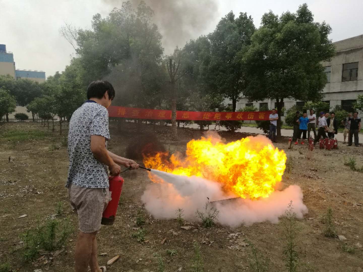 在消防安全知識培訓(xùn)結(jié)束后,消防員錢國圣、潘長昭組織大家進(jìn)行油盆滅火消防演練。