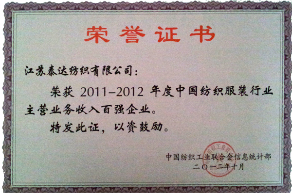 中國紡織服裝行業主營業務收入百強企業